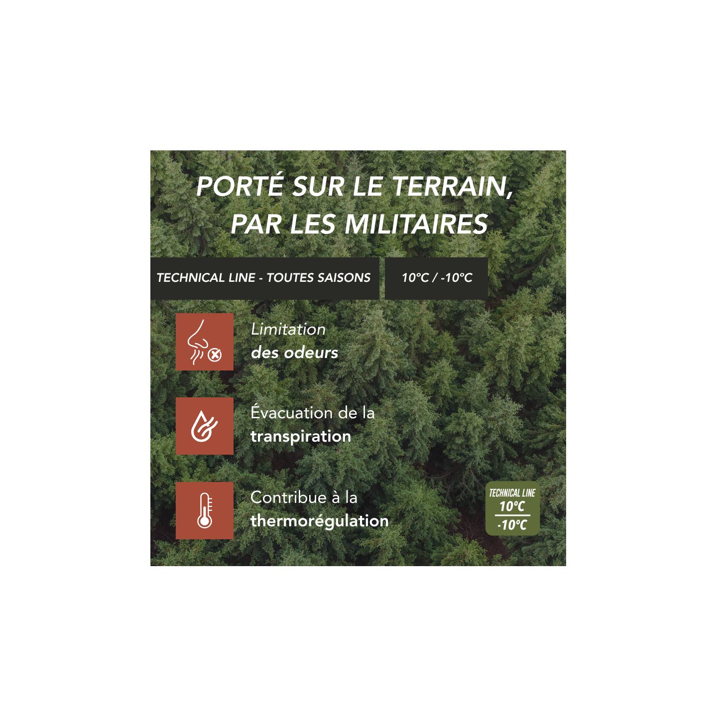 Fibre: Climatherm® (thermorégulation, évacuation de la transpiration, antibactérien et hypoallergénique), Composition : 85% polyester Climatherm®, 8% Élastomère, 7% polyamide,